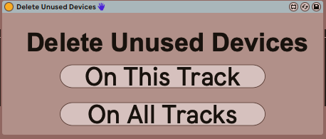 | Description: | This delete unused devices, either on the current track or on All tracks. I forgot to add return tracks. If anyone wants to add that, send it to me and I'll update the device. |