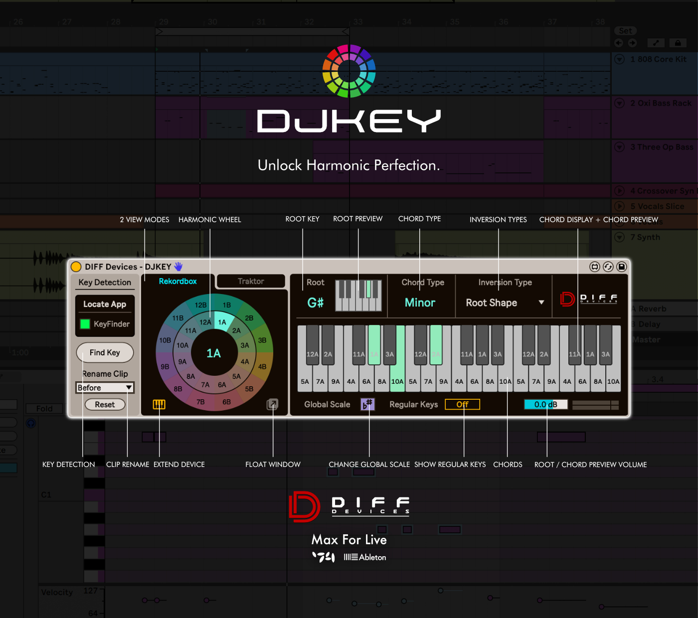 | Description: | DJKEY is an advanced Max for Live device designed to make harmonic mixing seamless and intuitive for DJs and music producers. Built to integrate perfectly into your Ableton Live workflow, this tool uses powerful key detection algorithms to help you identify and work with the musical keys of your tracks with ease. Whether you're creating mashups, crafting transitions, or simply ensuring harmonic flow in your set, DJKEY gives you all the tools you need to mix and produce like a pro. Take control of your harmonics with DJKEY – the essential tool for DJs and producers who demand precision and creativity. FEATURES: • Harmonic Key Detection: Quickly detect the key of your audio clips and display them in the Camelot Wheel format, compatible with popular DJ software like Rekordbox and Traktor. • Integrated KeyFinder Support: Locate the KeyFinder.app* to enable accurate and reliable key detection. • Chord & Scale Tools: Visualize the root key, chord types (e.g., major/minor), and inversion shapes on the piano roll for better harmonic understanding. • Key Compatibility: Highlight compatible keys to help you transition between tracks or compose harmonically sound music effortlessly. • Clip Renaming Functionality: Automatically rename clips with detected key information for better organization. • Global & Regular Key Modes: Switch between global key scales or focus on regular keys for detailed harmonic insights. --- Keyfinder.app* Is an open source key detection tool, for DJs interested in harmonic and tonal mixing. It's intended to be very focused: no library management, no track suggestions, no media player. Just a fast, efficient workflow tool. It supports a huge range of codecs thanks to LibAV, and writes to metadata tags using TagLib. The accuracy of the algorithm is pretty good. Here's a comparison with some other packages. I don't claim that KeyFinder is better than other key estimation software, but it shows that the algorithm is in the same league as even the best paid alternatives. I originally developed KeyFinder in 2011 as part of my MSc in Computer Science. The algorithms, design and implementation are described in some detail in my project report, which you can download, though it's a bit heavy going. More info : http://www.ibrahimshaath.co.uk/keyfinder/ — INSTALATION GUIDE: 1. Install Keyfinder.app in any location on your computer. 2. You can keep it closed the keyfinder.app. 3. Open ableton. 4. Drag and drop to the track that you want to find the key. 5. Press locate on DJKEY, and search for the Keyfinder.app. 6. Be sure that on DJKEY, the keyfinder.app is green. 7. Be aware that takes a few seconds to analyse the track, loops, or anything you want. (time depends on track size). -- MAC & WIN) * It requires Keyfinder.app to be installed on your system. * Only works in Ableton Live with Max installed. * It Requires Ableton Live V12 (minimum). |
