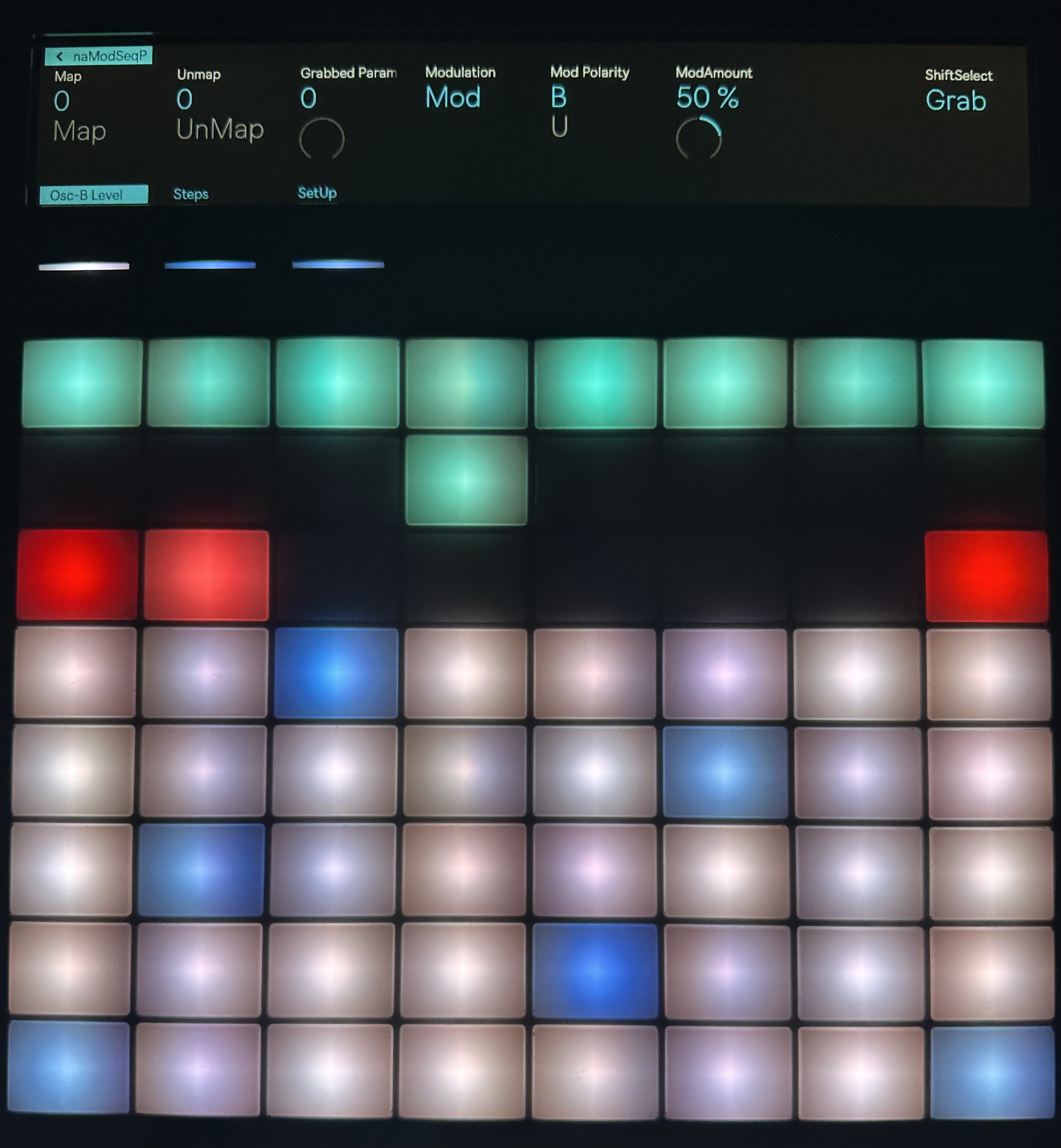 | Description: | This is a version of my other device NAModSeq that works with Push2,3 controller and standalone. It only has one sequencer instead of multiple but can be grouped into racks so you can have as many or as few as needed without taking up to much screen space on Push. There's no device UI as it's meant to be primarily used with Push 3 standalone. The following instructions for use are included in a popup on the device in Live if needed. After loading the device you should be able to “Grab” control of your Push3. If you’re using Push2 or if Push3 isn’t recognized navigate to the SetUp page and choose your controller. After that you can “Grab” control of your Push from either the SetUp page or the Map page. Once initially Grabbed you can also grab/release by pressing the shift and select buttons at the same time. Selecting another device, track or entering session view will release control of the Push, returning to note view or selecting the device will re”grab” the Push based on the last settings. To map a control- The Push needs to be “Grabbed” for mapping to work. Make sure the Push has been “Grabbed” and navigate to the Map page. Turn the dial to “Map” and select your chosen other device/parameter. When you reselect the device the “Map” bank will be renamed to the parameter you’ve chosen as an indication the mapping was successful. There’s also a “Grabbed Parameter” knob on the Map page so you can test that the mapping worked by ear. Selecting “UnMap” will, surprise, unmap the parameter and return the bank name to “Map”. There are controls for Mod type- Mod/Remote, Mod Polarity,-Bipolar/Unipolar, Mod amount and Range depending on the Mod type selected. The Steps page has 8 knobs for setting the mapped values that will advance every time a midi note enters the device from a clip. Push Control- The top row of the Push Button Matrix is used to set the amount of steps the sequencer has, changes are reflected in the Push Steps display. The color of the pads can be chosen from the SetUp page, this can help, somewhat, with remembering what’s what if using multiple devices. The second row is a display for the currently playing step in the sequence. On the third row the left Dark Red button will randomize the step values, the Light Red button will scramble the vales and the right Dark Red button will reset all values to zero. |