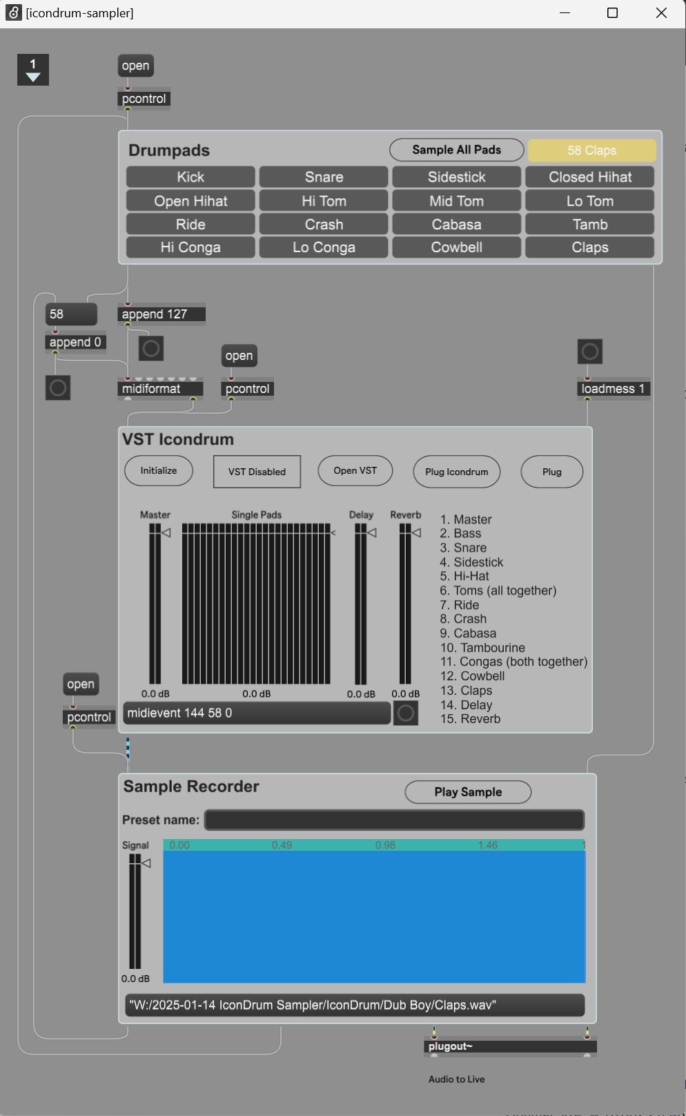 | Description: | Gforce Icondrum Sampler The Gforce Icondrum Sampler is a MaxForLive device designed to create sample sets from the Icondrum plugin. These samples can then be used to build custom drum racks. This device features a simple patcher interface with three bpatchers and a few connecting wires—no fancy UI. Installation & Setup Place the .amxd files in a location where they can be opened in Ableton Live. Ensure this location contains a subfolder named Icondrum, as this is where the samples will be saved. Import the Icondrum Plugin Press the "Plug Icondrum" button to load the plugin automatically. If this fails, press "Plug" and manually locate the VST file. On Windows, the VST3 file is typically located at: C:\Program Files\Common Files\VST3\IconDrum.vst3\Contents\x86_64-win\Icondrum.vst3 Unfortunately, Mac compatibility is untested and cannot be guaranteed. Enable Multi-Channel Output After loading the plugin, press "Open VST" to launch the interface. Click the small wrench icon in the upper right corner of the plugin interface and set "Multi-channel output support" to On. Functionality Initialize Parameters Press the "Initialize" button to reset all plugin parameters to their default values. If you load another preset in the VST, the device will automatically use the parameter values saved in that preset. Play and Record Samples Use the upper bpatcher to play individual drum pads. To record samples, enter a preset name in the lower bpatcher and press "Sample All Pads" in the upper bpatcher. This will sample and save sounds from all 16 drum pads, each in a separate stereo WAV file. Closing the device When closing the Live Set with the VST plugin enabled Live is likely to crasch, so disable the plugin before closing the song. Compatibility The .zip download includes versions for: Ableton Live 11 or 12 with Max 8 Ableton Live 12 with Max 9 |