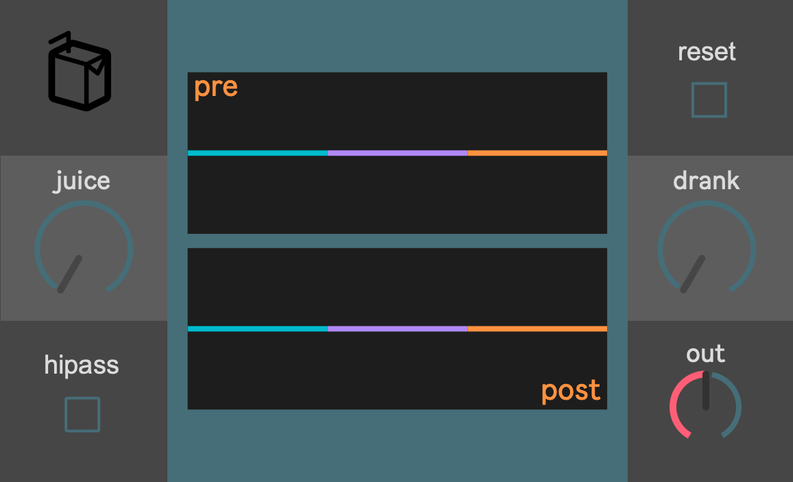 Description: | oh hey joey. juicebox is a distortion bro. it uses bit reduction, into a multi band drive then into a saturation stage, because it sounds 🔥. the distortion is preceded and followed by 3 band EQs, to sculpt what gets driven and what comes out. friggin science. used lightly you get hella warmth and glue. crank that dial for a full on bonfire. demo: https://youtu.be/rVPCWg8wZJQ “juice” is the amount of distortion, thats why we’re here. “pre” and “post” sliders control a 3 band EQ each, before and after the juice. this allows tone sculpting into and after the drive for hecka flexibility. “reset” clears the EQ settings and returns everything to 0… “drank” is a wobbly vibrato for all that vinyl sim you know you need. “hipass” is a hi pass, pre distortion, get it? “out” is the output volume that comes just after a gentle “british” console type o’ EQ response. grump m4l plugins are made for fast and creative audio mixing. no values are displayed or exact numbers used, so you rely on what you hear. get some! |