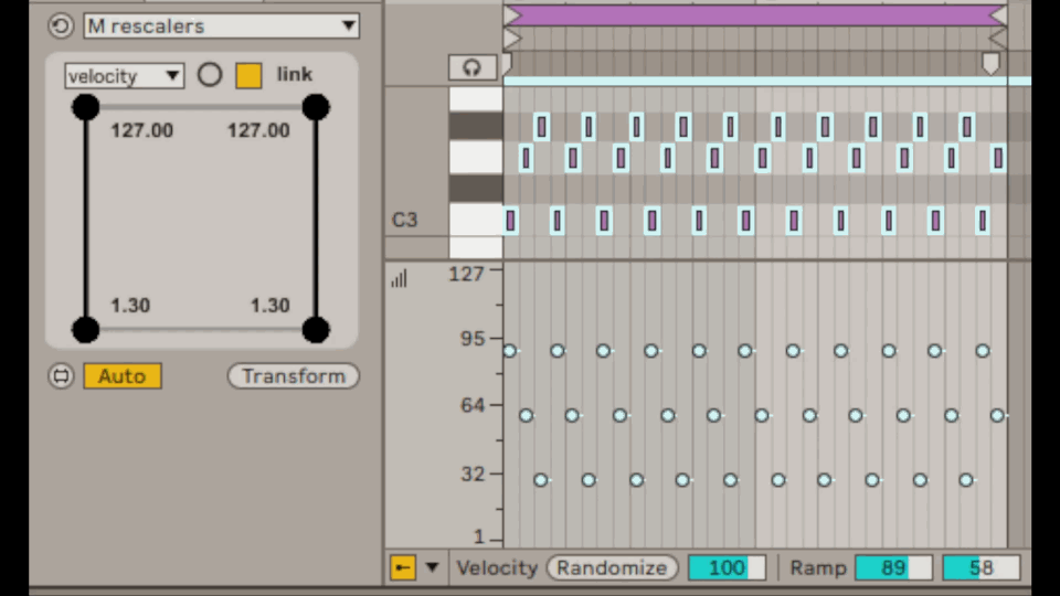 | Description: | Remaps midi infos (velocity, note, duration) from one range to another, also allowing different values for the beginning and the end of a sequence. lastest updates : 2025 10 27 > started rewriting it entirely in js instead of hybrid Max/Js logic 2026 01 21 > values display |
