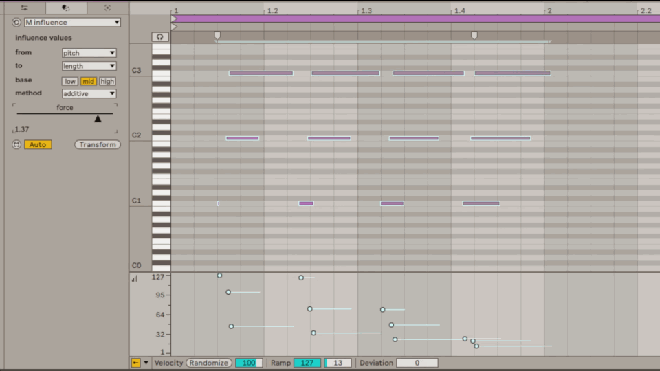 | Description: | Modifies a given parameter according to values from another parameter on a series of notes. (pitch, velocities, start time, durations, probabilities) latest updates : 2025 03 30 > fixed bugs due to the use of global sends |