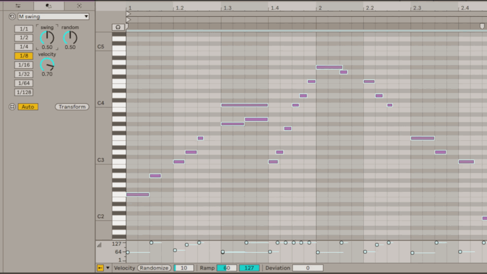 | Description: | Swing MIDI Transformation Device. I know there are already several swinging tools but I built this one to better fit the way I personally use swing : - support for extreme and inverted swing values - swing can be applied to divisions ranging from 1/128 up to 1/1 - intermediary notes are continuously interpolated instead of moved towards the closest quantization point - note durations adapt to the swing - velocity shaping for accents or dampening - randomness only affects the swing timing and keeps the base groove and notes alignment intact latest updates : 2025 03 30 > fixed bugs due to the use of global sends 2025 04 07 > more control on the fake randomness |