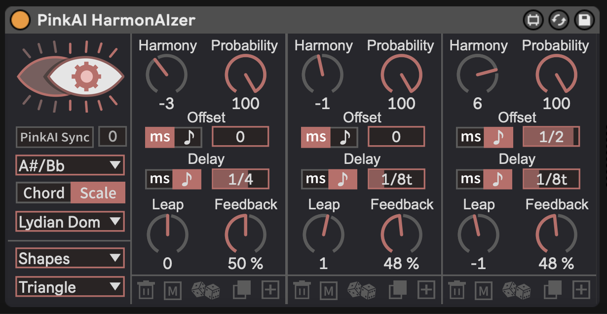 | Description: | CREATE RICH, HARMONIZED MIDI DELAY LINES PinkAI HarmonAIzer transforms the simplest MIDI into captivating and rich harmonic patterns: HarmonAIzer receives any individual MIDI note from any of your MIDI Clips, MIDI Controller Input, or from PinkAI’s Performer Module and creates anywhere from basic-to-intricate, practical-to-abstract reharmonized sequences within your pre-selected scale, using Probability, Note Offsets and Pitch-shifting Feedback loops. With 12 keys, 25 chord types, and over 30 scales to choose from, HarmonAIzer offers nearly 700 tonal colors, making it so simple to explore diverse and astonishing melody, harmony and dynamic musical patterns all the while learning and applying some fundamentals of music theory. HarmonAIzer synchronizes output with the PinkAI Conductor module’s auto-generated or user-programmed chord sequences: HarmonAIzer works both as a standalone device as well as with PinkAI’s Generative Composer. Turning on “PinkAI Sync” lets your pre-recorded MIDI Clips revoice to fit with the generated chords (or chord-based Scales) from the PinkAI Conductor module. Feed HarmonAIzer with MIDI input from PinkAI’s Performer module and generate ever-changing, richly harmonized musical compositions. Modern, flexible and responsive User Interface with 150+ quick-change presets makes it extremely easy to get started: Add, Delete, Copy or Randomize patterns in up to 9 simultaneous harmonized voices with HarmonAIzer’s easy-to-use, engaging and intuitive user interface. Select from 9 different built-in Preset Banks to learn how HarmonAIzer excels at creating vibrant, harmonized arpeggios (“Rainbows”), elaborate melodic patterns (“Color Riffs”), polyphonic polyrhythms (“Polyrhythms”), practical strumming patterns (“Strum and Pick”), and much more! Combined with the variety of tonal colors, HarmonAIzer offers 100,000+ possibilities in MIDI output by using the same single MIDI Note input. HarmonAIzer receives any incoming MIDI note and transforms it into chord- or scale-based harmonic patterns using any of the following controls for up to 9 simultaneous harmonized voices: - Harmony: Determines the interval in # of chord or scale tones of the initial harmonized note. Ranges from -12 to +12. If a triggered MIDI Note does not belong to the selected or generated chord or scale, HarmonAIzer will automatically adjust the MIDI Pitch to the nearest chord or scale tone. Changing the Harmony dial to +1 will increase this converted pitch by 1 chord or scale tone. - Probability: Determines the likelihood of the initial harmonized note occurring. 100% ensures that the incoming note will be harmonized and output. 0% disables output. - Offset: Allows for displacing the harmonized incoming MIDI note by either Time (ms) or Note Values (i.e. quarter, 8th, 16th notes) - Feedback: Like with most audio-based delay devices, Feedback determines the amount that an individual harmony repeats itself (in a MIDI delay line). 0% indicates that only the initial probability-based harmony will sound, and 100% indicates that the harmony will repeat infinitely (until playback is stopped, line is muted, or feedback is reduced). - Delay: Sets the interval/rate of repeats in the MIDI delay line in either Time (ms) or Note Value increments. When Feedback is set to 0%, changing this Delay time has no effect. - Leap: Sets the interval in # of chord or scale tones of each successive delayed MIDI note. Ranges from -12 to +12. When Feedback is set to 0%, changing the Leap amount has no effect. HarmonAIzer’s 9 Preset Banks with over 150 quick-change Presets offer incredible diversity in output. Every single preset can be a phenomenal launching point for discovering the power of HarmonAIzer. Often times, adjusting a single dial on one preset’s harmony line results in fascinating, practical and creative changes difficult to otherwise conceive of. HarmonAIzer’s Preset Banks include: - “Rhythm Grids”: Rhythm Grids presets are labeled with 2 numbers, i.e. “2x8”. The first number indicates the number of harmonized notes output for every MIDI note, and the second number indicates the number of notes per measure, as defined by the subdivision. “2x8” indicates that one incoming MIDI note will transform into a 2-note chord with an 8th note delay line. Preset options allow for dyads (2-note chords), triads (3-note chords) and tetrads (4-note chords) with rhythmic delay lines of 3/8, 1/2t, 1/4, 1/4t, 1/8, 1/8t, or 1/16 notes. - “Shapes”: This bank of 18 presets takes in one MIDI note and outputs time-arranged patterns that look like shapes constructed of MIDI notes. In “Triangle”, for example,” hear the incoming note repeat as is, while a second voice carries its delay line up and down (from and back to the original note). - “Rainbows”: Rainbows are collections of polyphonic up and down arpeggios with serendipitous harmonic overlaps, creating potential for intricate patterns when used with variously spaced MIDI note input. - “Color Riffs”: This bank of 18 presets turns a single MIDI note into a full-measure melody, phrase, or riff. These are most effective when used with instruments with minimal velocity sensitivity. - “Polyrhythms”: The Polyrhythms bank expands the traditional concept of polyrhythms to include harmony, as each overlapping rhythm in a given preset is created with a distinct voice / harmony. Truthfully, these should be called - “Harmonic Polyrhythms”, but that felt too long for a truncated preset dropdown ;). - “Time Shifts”: This collection displaces the incoming note by shifting it forward in time in most cases by note value. The first 12 presets in this bank use a similar naming system as with “Rhythm Grids”, where the first number represents the number of harmonized notes into which the incoming note is divided, and the second number is the note value of how far the harmony is displaced forward. Additional preset pat
