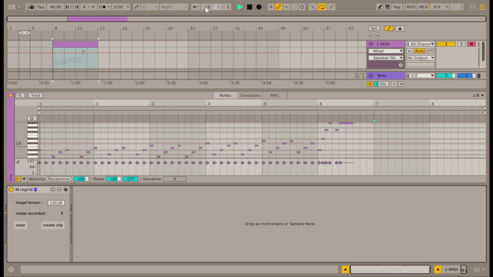 | Description: | This is a MIDI device that "commits" tempo automation into a fixed-timing MIDI clip. A typical use case would be if you want to export a MIDI clip that takes tempo changes into account. The resulting clip will overwrite the first slot of the session view for the current track. Demo : https://www.youtube.com/watch?v=hOW_mvoIK8o It is still WIP, only copies notes for now and no other MIDI info. latest updates : 2025 06 05 > sustain pedal status can now be "baked" into updated note durations. |