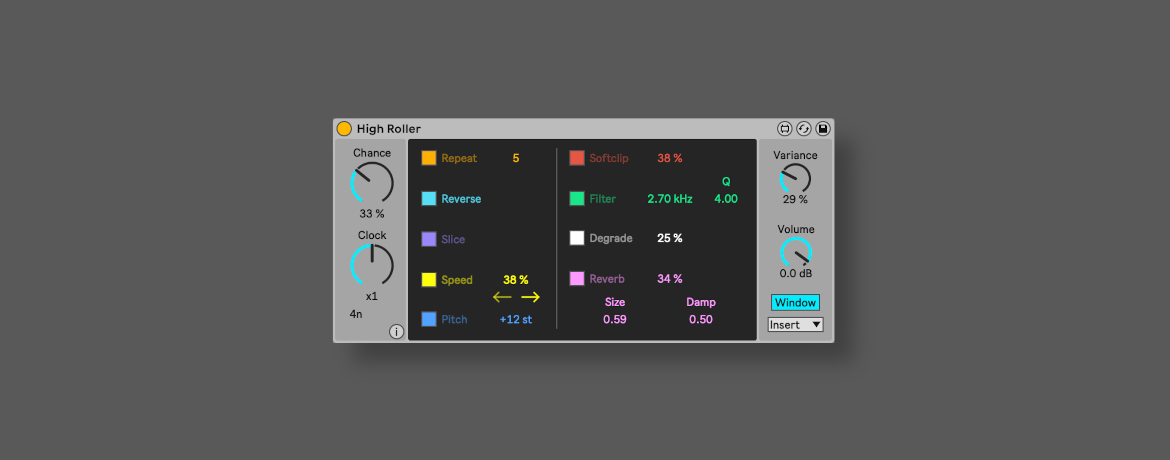 | Description: | High Roller is a chance-based multi-FX Max for Live audio device designed to bring subtle variation or chaotic mangling to your tracks. Key Features: - 9 creative effects: Repeat, Reverse, Slice, Speed, Pitch, Softclip, Filter, Degrade, and Reverb. - Chance-based triggering, synced to Live’s transport for smooth, musical results. - Variance dial for even more unpredictable, dynamic effect values. - Fully optimized for Ableton Push controllers. Compatibility: - Requires Ableton Live 11/12 Standard (with the Max for Live add-on) or Ableton Live Suite. |