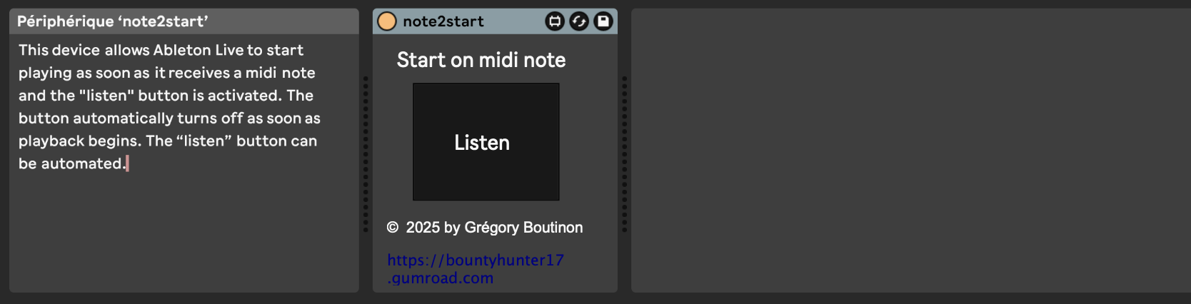 Description: | Start Ableton Live while playing midi note. This device allows Ableton Live to start playing as soon as it receives a midi note and the "listen" button is activated. The button automatically turns off as soon as playback begins. The “listen” button can be automated. |