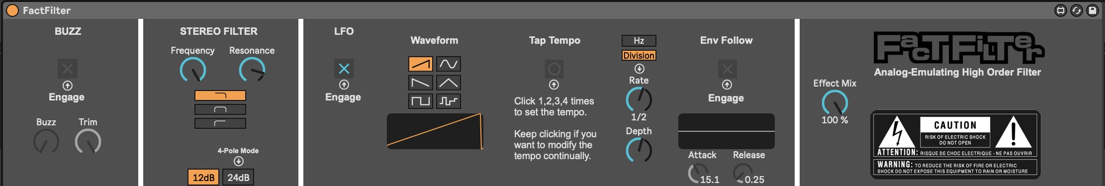 | Description: | FactFilter is an analogue-emulating 2-pole/4-pole stereo filter inspired by the Electrix Filter Factory, designed from the ground up to emulate the original hardware, featuring a stereo filter, Buzz (overdrive), LFO, and Envelope Follower. Tutorial Video: https://youtu.be/LQF00yChonw Send any questions or feedback to: joelarby12@hotmail.com |