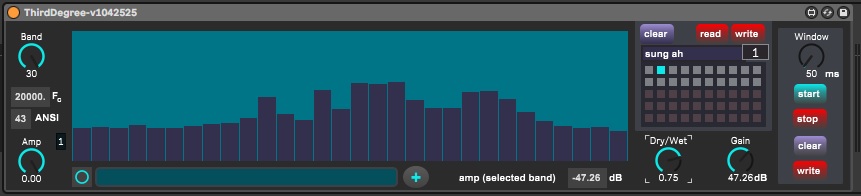 Description: Third Degree imposes a 30-band, third-octave filter complex upon all incoming audio and also doubles as a third-octave band spectral analyzer. It was originally designed for use in research projects within our university lab research as a rapid way to derive spectral envelope shapes from natural sound sources and then apply them to other material. Like all our plug-ins, the device also has been conceived with musicians in mind.