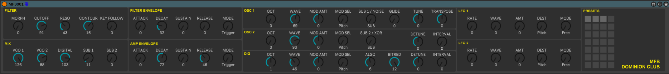 | Description: | A complete MIDI-CC controller for the MFB DOMINION CLUB. Features: Full MIDI-CC coverage for DOMINION CLUB firmware 1.05 Preset saving and recall Optimized for use with Push 3 All parameters neatly organized in Push 3 banks Note: Save presets by Shift-clicking the small squares in the preset block. Recall presets by simply clicking the small squares in the preset block. Presets are stored within the session. |