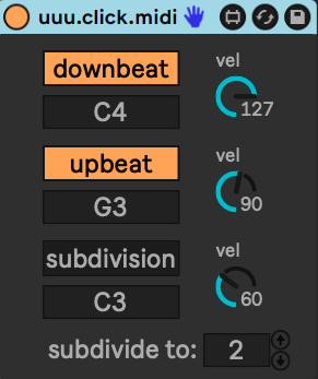 uuu.click.midi generates midi notes that can be used with a midi instrument of your choice for a click track. you can customize the midi notes and velocities used for downbeat, upbeat, and subdivisions. you can also change the number of subdivisions. |