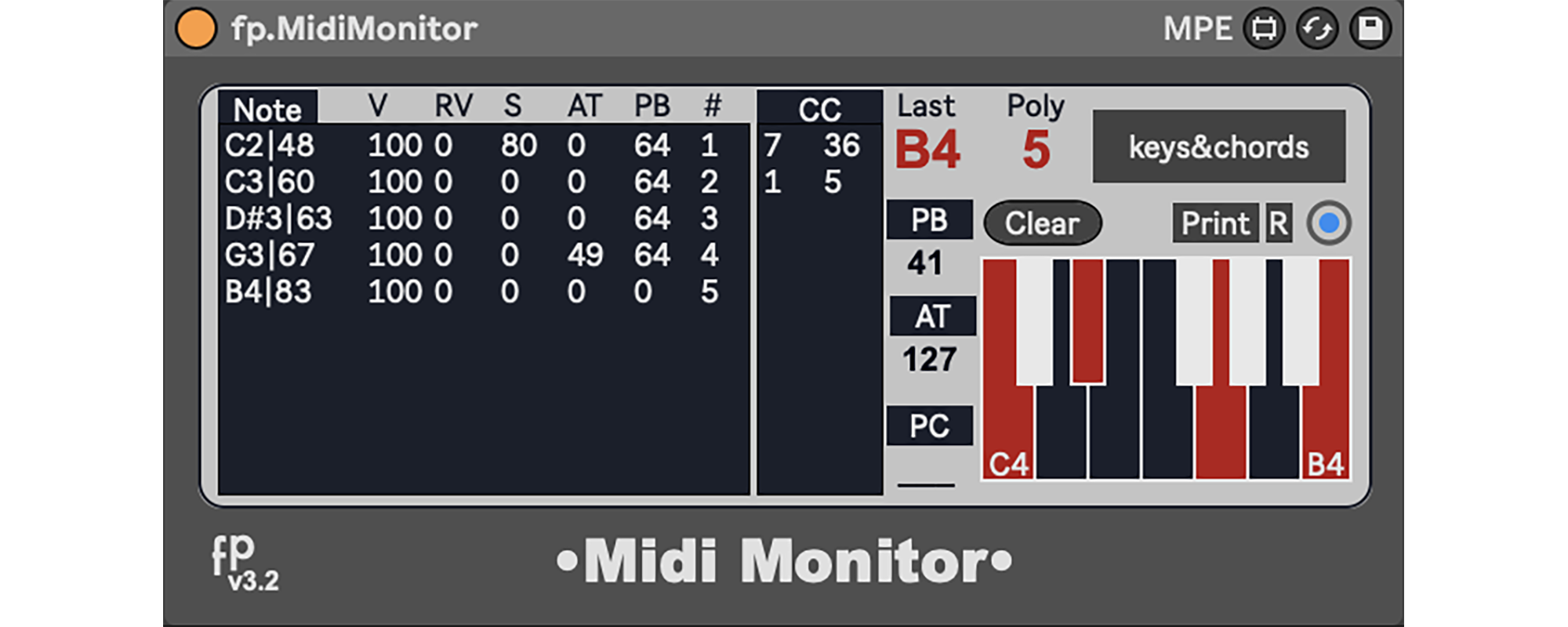 | Description: | Advanced Midi Monitor - Display: MPE [Pitch, Velocity, Release Velocity, Slide (CC74), Pressure, Pitchbend] / Last 10 CCs / AfterTouch / PitchBend / Program Change / Last Pitch / Polyphony - Keys and chords floating window. Tested up to OSX Ventura / Live 12.1.11 / Max 9.0.5 / Apple silicon ok. It should work on Windows... |