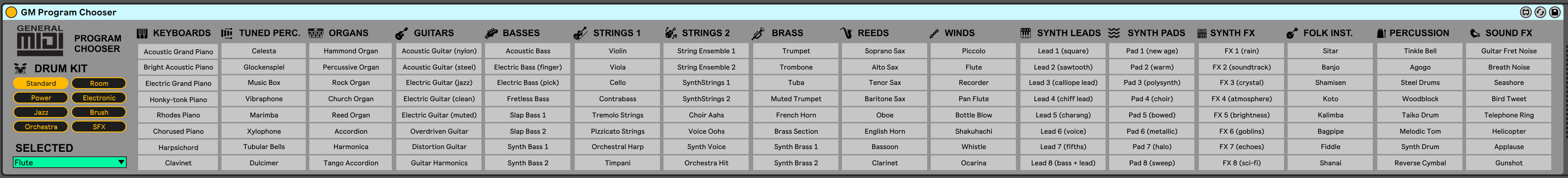 | Description: | This is a simple device that will allow you to use General MIDI programs very quickly. 1. Create a new track. 2. Setup the channel and device on the track. 3. Drag the device onto the new track. 4. Choose programs from device. --- For DRUMS you must use MIDI Channel 10 for your track. --- Icons thanks to noun-icon https://thenounproject.com/legal/terms-of-use/#icon-licenses --- I used a work-around for the buttons and clicking without selecting one, because would you believe that the Ableton Buttons M4L control only allows up to 64 buttons? :) --- GENERAL MIDI PROGRAM CHOOSER v1.0 by grymmjack https://github.com/grymmjack/max4live |