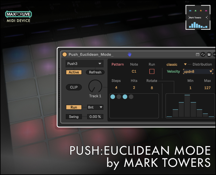 | Description: | CREATE EVOLVING POLYRHYTHMS WITH TACTILE PUSH CONTROL AND ALGORITHMIC PRECISION Step into the world of geometric grooves with Push Euclidean Mode – a Max for Live rhythmic sequencer by Mark Towers, designed specifically for Ableton Push 1, 2, and 3 Generate dynamic, evenly distributed patterns across 16 tracks using the power of Euclidean logic, all from the comfort of your Push’s 8x8 grid. With intuitive hands-on control over steps, hits, rotation, pitch, velocity, and more, this device is a creative playground for producers who want their rhythms smart, flexible, and performance-ready. Perfect for live jamming, generative composition, and precision sequencing, Push Euclidean Mode keeps your ideas flowing with minimal setup and maximum tweakability. Use Shift modes, velocity presets, real-time overrides, and global rate control to craft beats that evolve with your performance. - 16-track Euclidean step sequencer fully mapped to Ableton Push - Independent control of steps, hits, rotation, pitch, velocity per track - Real-time performance editing and manual overrides - Velocity shaping with 16 expressive presets - Global swing, rate control, and pattern export to MIDI - Compatible with Ableton Live 12 and Max for Live - Supports Push 1, Push 2, and Push 3 hardware including Standalone https://youtu.be/6VmieZux4p4 |