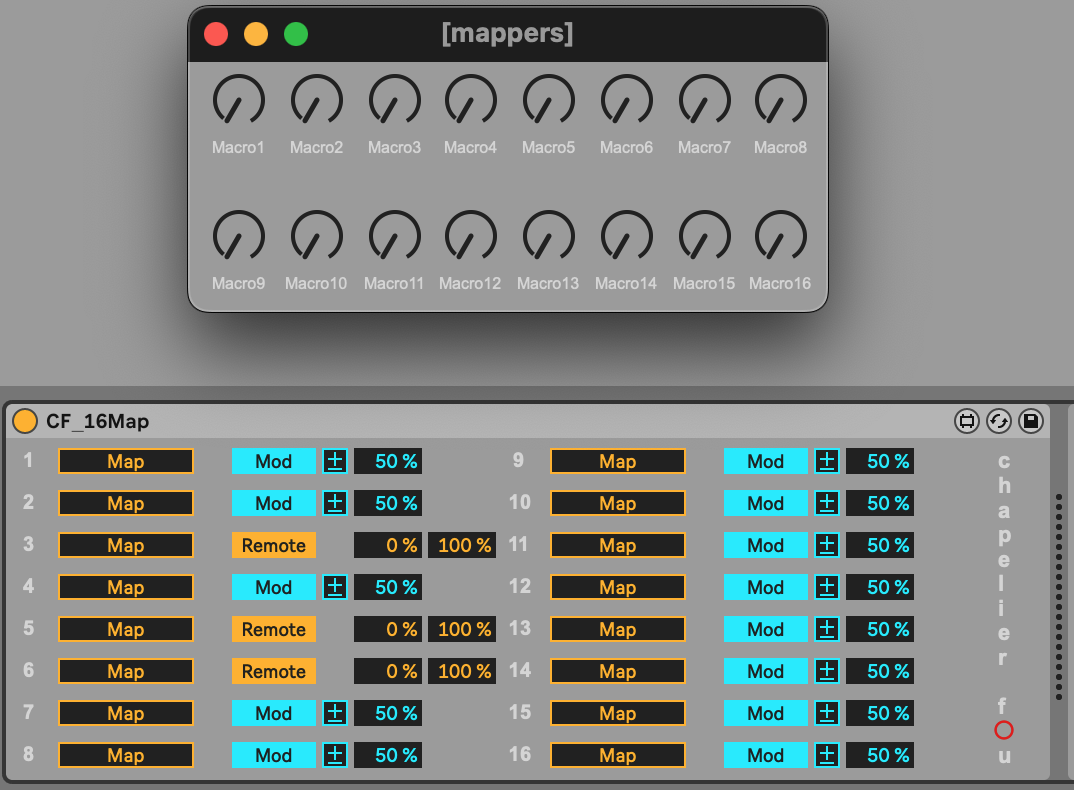 | Description: | Simply Map 16 knobs to 16 parameters. To Midi or Macro Map, hit the "o" in "chapelier fou". Bugfix 20250506 : wasn't passing audio through. |