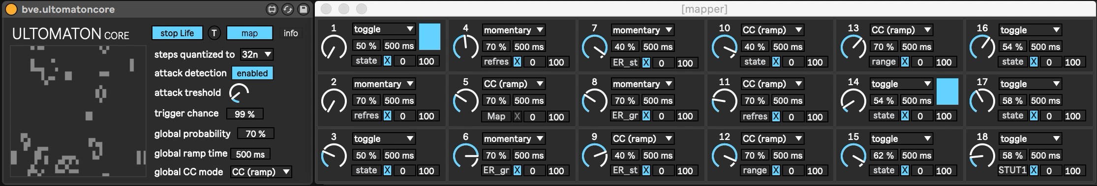 | Description: | This device is a M4L version of the core of my standalone app 'Ultomaton', which has built in loopers, granulator, freeze and other effects. more information at http://www.benjaminvanesser.be/software/max.html bve.ultomatoncore uses John Conway's Game of Life to trigger 'events'. These events can be mapped to any parameter inside Ableton. The Game of Life is driven by audio input (attack detection). Although the Game of Life is at the very core of this application, bve.ultomatoncore feels very much like a game of chance, which can be controlled by the performer to some extent. bve.ultomatoncore is slaved to Live's transport. In other words, Live's transport has to be be active in order for the Game of Life to run. |