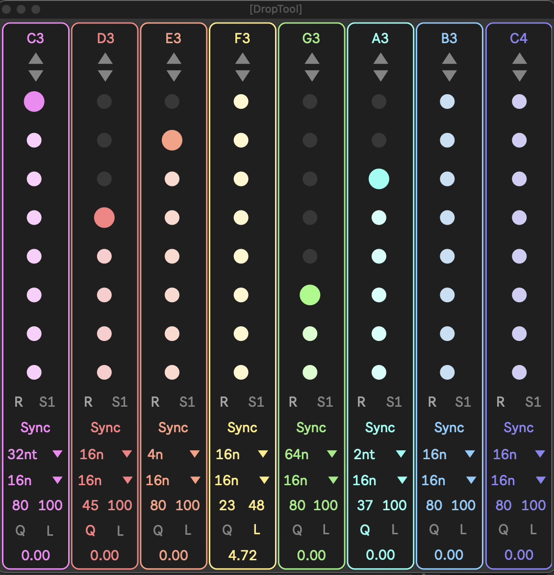 | Description: | 1.1 Added UI scaling DropTool is a midi generator based on my sequencer DropSeq. If you've used the sequencer it works in the same way but as a miditool. In a popout window there are 8 lanes, each lane has a column of 8 dots when the dot "hits" the bottom a note is created. The controls are top to bottom- Note created with an octave switch. The Dots, clicking an empty dot will place the start point and clicking a filled dot will turn that column off. R- reverses the pattern. S1- skips the first note created, this can be useful to avoid "Chords" on the first note in a clip. Sync- sets the "rate" of the lane and note duration to be either in note divisions or free. The lanes rate. The notes length. Velocity range Q-quantize L-legato Rotate the pattern. Honestly I kinda think this works better as a sequencer than a miditool but I got the idea stuck in my head and had to make it haha. |