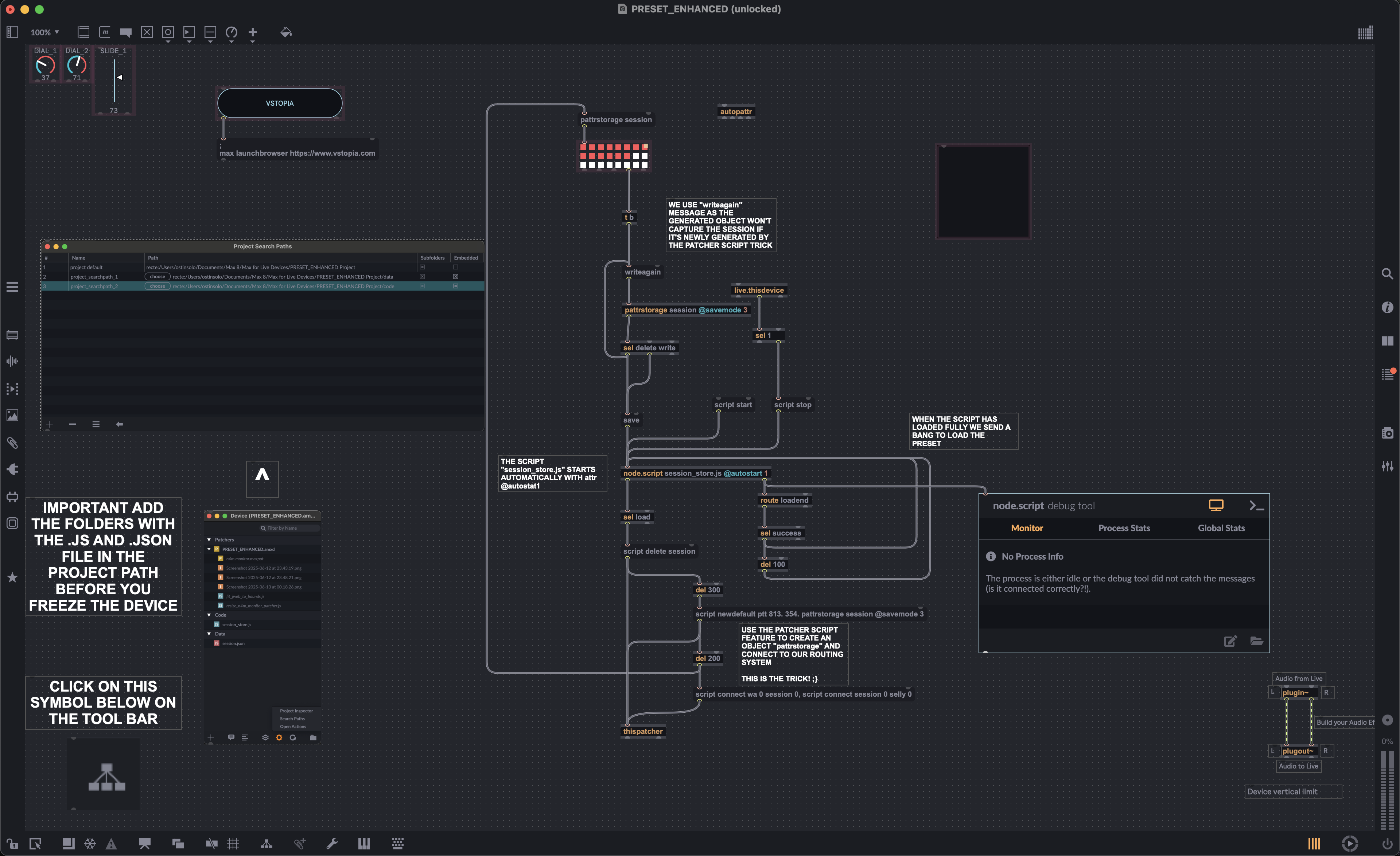 Normally, when a Max for Live device is frozen and distributed, Ableton opens it in a temporary folder at runtime. That means any presets saved during the session are lost when Ableton closes, unless they are manually exported.