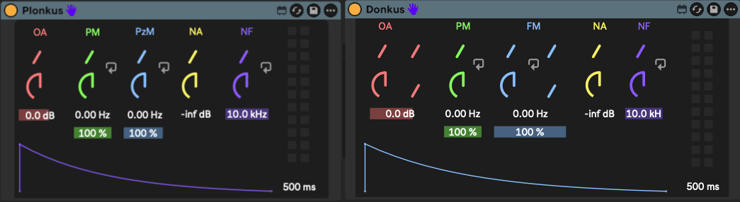 | Description: | Plonkus and Donkus are two similar but slightly different Percussion synths I made. Plonkus uses stock cycle objects and does Phase MOD, Pitch Mod and has Noise with a few looping envelopes. Donkus uses the new ABL objects and does FM, Pitch Mod and has Noise with a few looping envelopes. They're almost identical but I thought they sounded different enough and liked them both for separate reasons. They're both mapped for Push but there's not any real visual feedback on Push of what the controls are doing so you'd just have to play around with them. As far as I know Plonkus should work on Push Standalone? I don't have one to try it out but it's all pretty stock. Donkus may? I have no clue if the ABL objects work on Push Standalone or not. |