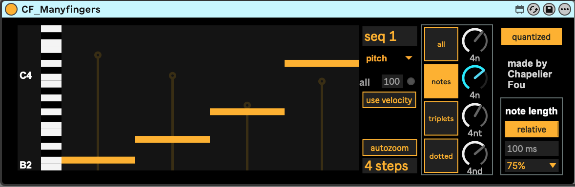 | Description: | Manyfingers puts a step sequencer for each of your fingers. You draw a monophonic sequence, then it's played for every held voice. Store up to 16 sequences. It's better than you think. Video demo : https://youtu.be/UIc9bI_GR2A chapelierfou.bandcamp.com |
