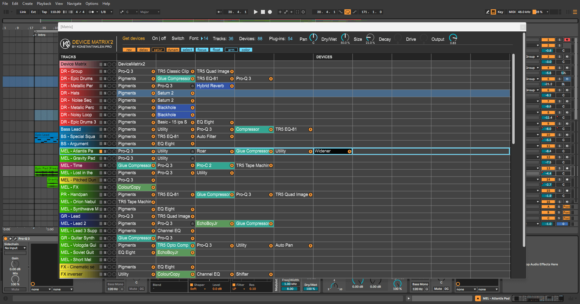 | Description: | Device Matrix 2 is a Max for Live plugin that lets you display and control up to 1000 Ableton Live (or VST) instruments and effects on a single screen. It’s the perfect assistant for mixing, sound design, and music production. Fully compatible with Ableton Live 12.1 and above. What’s new in version 2.0: - Device Matrix now supports up to 100 tracks; - Project color coding import; - Arm tracks directly from the Matrix; - Edit pan directly from the Matrix; - Edit reverb parameters from the Matrix (native and VST); - Edit saturator parameters from the Matrix (native and VST); - Disable effects in a chain without turning off the instrument; - Effect highlighting based on type (native and VST); - Improved performance in most use cases. Key features: - Enable and disable devices (including VST plug-ins) or chains across the entire project; - Quickly adjust Dry/Wet parameters for any native device or VST plug-in; - Select track from the Device Matrix; - Instant project overview; - Statistics. |