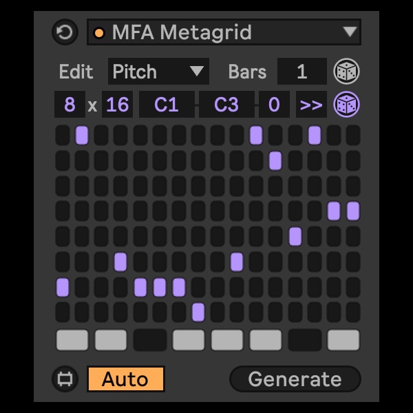 | Description: | Metagrid generates richly layered polymetric sequences using up to eight independently controlled parameter grids: Pitch, Velocity, Length, Chance, Octave, Mute, Multiple, and Divisor. Each grid operates with adjustable step count and selectable value range, supporting forward, reverse, elliptical, or random playback. Individual lanes can be randomized and independently scaled to create intricate, overlapping cycles that evolve across time. Optional grid modes for rhythm allow Multiple and Divisor to break free from global timing for deeper complexity. Patterns can extend up to 512 bars, and global randomization lets you instantly reconfigure grid choices, step lengths, and fills. With staggered lengths and discrete modulation per lane, Metagrid excels at unfolding endless shifting, harmonically grounded, hypnotic structures that push beyond traditional sequencing constraints. Already comes included with MIDI Toolset 003 and our MIDI Tool Bundle. Requires Live 12.2 running Max 9.x |