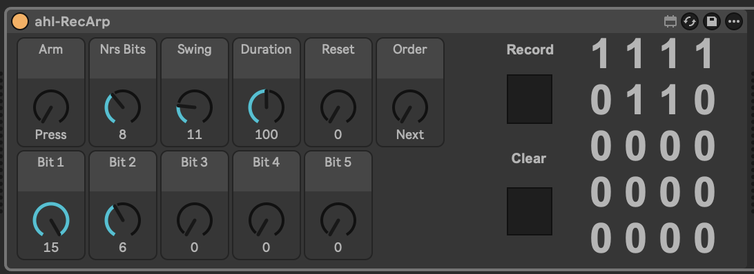 | Description: | I made this simple thing for my Ableton Push 3 Stand Alone Binary pattern-based arpeggiator that records and plays back your MIDI input Records your MIDI performance into memory, then plays it back using binary trigger patterns. Same binary logic as the Note Arp, but using your recorded notes instead of held chords. Recording Parameters: Arm: Recording mode Press: Manual - click Record button to start/stop recording Timeout: Auto - starts recording when you play, stops after silence timeout Record: Manual record button (for Press mode) Clear: Erases recorded memory Order: Playback sequence Next: Plays recorded notes in order Random: Randomly selects from recorded notes Pattern Parameters: Nrs Bits: Total pattern length in 16th notes (2 = very short pattern) Swing: Timing groove amount (0 = straight) Duration: Note length percentage (100 = full length) Reset: Pattern restart control (0 = free-running) 5 Bit Trigger Patterns: Bit 1 = 10: Binary 1010 = "X-X-" (triggers on steps 1,3) Bits 2-5 = 0: All silent = "----" (no triggers) How it works: Record a phrase (chords, melody, whatever) Binary patterns determine when recorded notes trigger Order setting controls whether notes play sequentially or randomly Creates rhythmic variations of your original performance Perfect for creating complex rhythmic treatments of recorded musical phrases. |