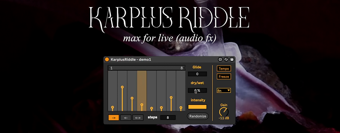 Description: | Karplus Riddle is a max for live audio effect designed to sculpt rhythmic and evolving plucked or comb-like textures from any sound source. Built around a minimalist step-sequencer, it modulates micro-delay times per step, allowing for dynamic textural shifts, tempo variations, and gliding transitions. Applied to drums, it recalls the metallic, glitchy sonorities of early IDM (Autechre, µ-Ziq, Aphex Twin); with ambient material, it opens up into rich, atonal progressions. Youtube demo: https://www.youtube.com/watch?v=bmMzLeVFweo |