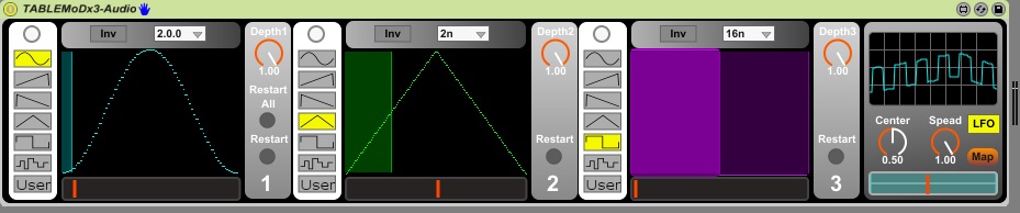 | Description: | hello, Is an triple lfo syncro, you can play Free(start), or automate the start time with the little button "restart" one by one or all with"all restart" button. Create with Objet [table] ps: work with the global transport.. when live is playing |