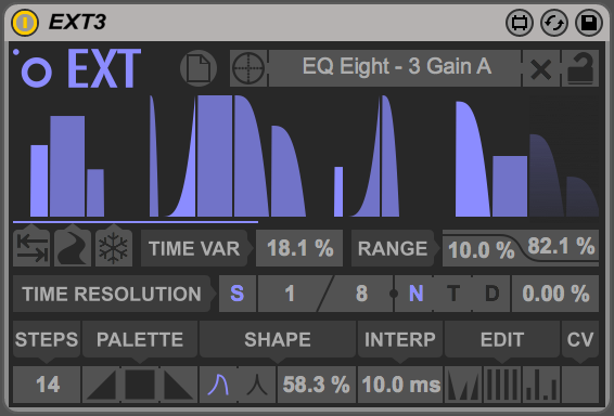 | Description: | CONTROL ANYTHING, SHAPE ANYTHING… NOW IN VERSION 3! EXT3 is a complex step sequencer modulator and powerful envelopes generator. It’s designed to modulate anything you want in Ableton Live: any parameter in other devices, in Live’s UI, and in any third party plug-in. EXT is very easy to use: just click the “select” toggle, then click the parameter in your Ableton Live set to apply the modulation. EXT3 offers rich time control, and an envelopes section where you can shape each step differently. This gives you access to infinite sequences creation! Thanks to features like complex time resolution, time variation, and swing, you read your sequence in so many different ways! Ext3 can swing too: increase the amount, and let your modulation get groovy! Needs some randomness? Just enable drunkwalk function to pick steps randomly, introducing on the fly a momentary random variation, keeping the original sequence stored. To perfectly fit to any target, you can refine modulation scaling outcoming values to a specific range, and applying interpolation time between steps for a smoothy control. The big news in version 3 are step editing and CV: you can change any step from a flat value to an envelope thanks to shape functions, and setting independent length for any step. Enabling CV, EXT sends a modulation signal on left channel, and gate messages on the right one. This lets you control outboard equipment as Eurorack modular systems (DC coupled audio interface or D/A converter is required). All these features make of EXT3 a terrific and unique modulator :) EXT3 is the best tool to fast create automated patterns, and to modulate a parameter in unexpected ways! |