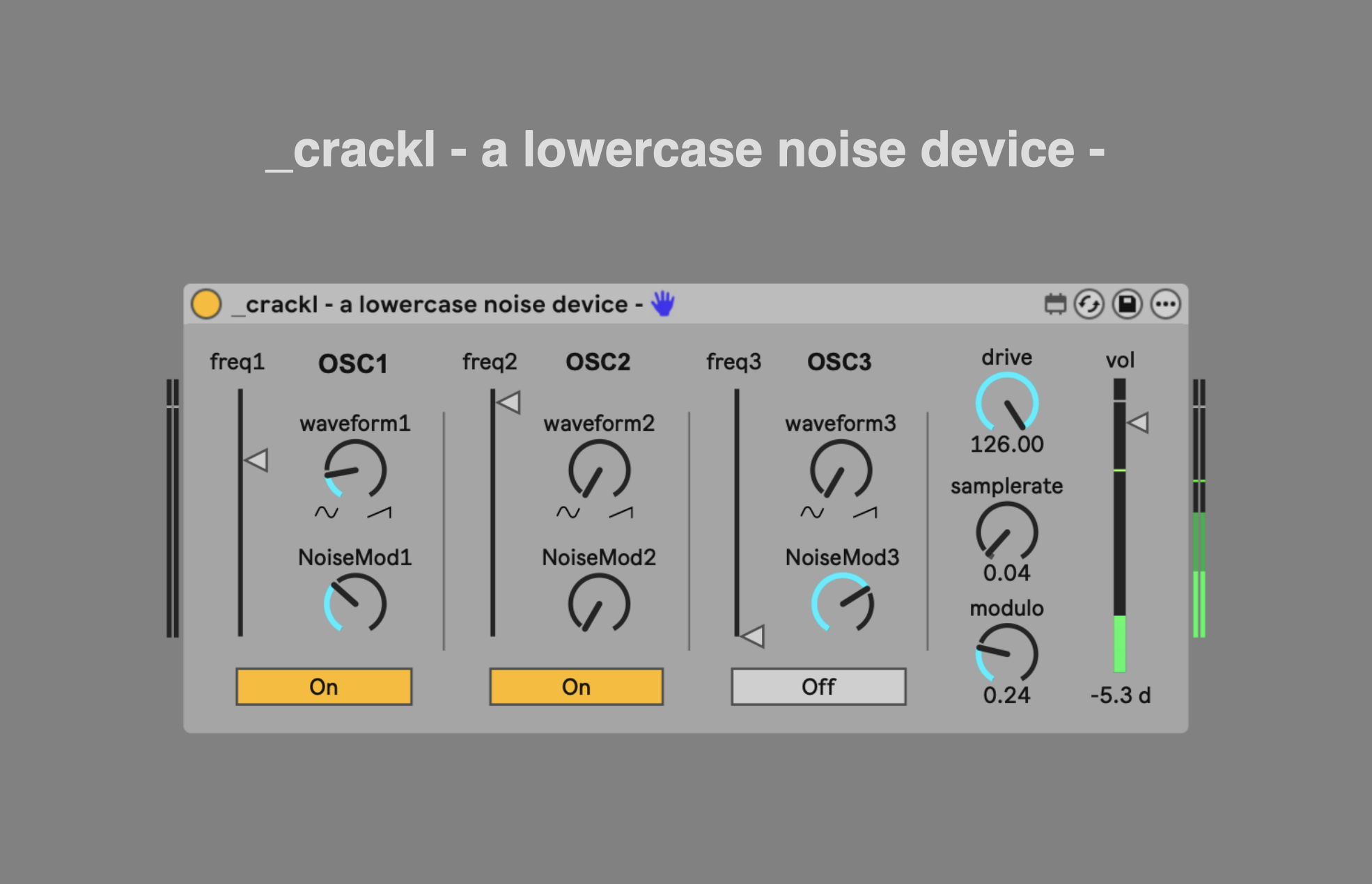 | Name | Version: | crackl - a lowercase noise device 1.0 |