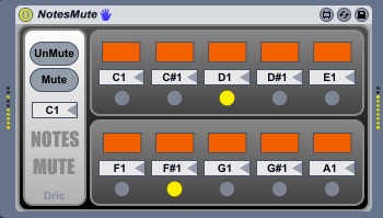 | Description: | Hello, This devices is simply for mute some specific notes. I use for mute my drums on the "drum rack" rather that muting audio.. This can be useful if you have a delay or reverb on your drums.. But you can use for any sequence midi (track midi) synth or ect.. If 10 notes not enough, you can add Sev "Notes Mute" 2.1 : The Button "Mute" "UnMute" bang lit and extinguished now.. This is useful if you learn the buttons on a controller that not manages the mode toggle, momentary ect.. (ex: Launchpad mode User2) 2.2 : I add note base.. if the notes is follow, for shifted all faster Sorry for my english |