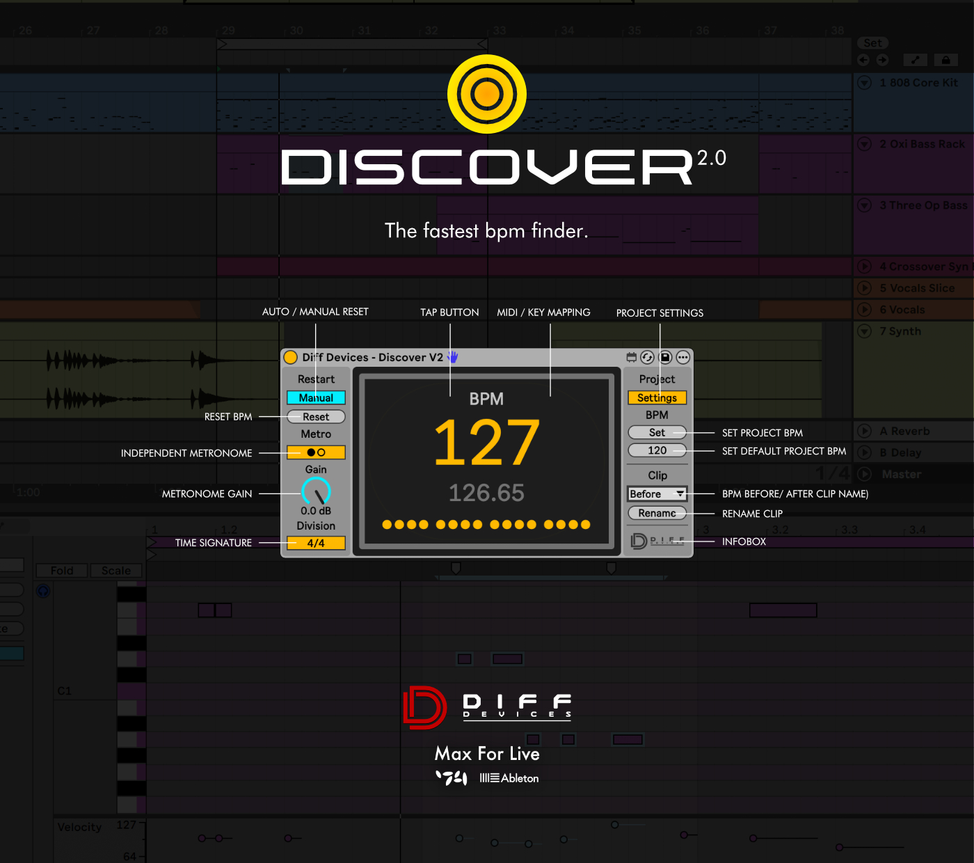 | Description: | DIFF Devices - Discover V2 The fastest BPM finder. Simply put discover on a track (midi or audio) and tap to find the bpm. Sometimes Warp doesn't work so good in ableton with this tool it's super easy and fast to find the bpm. *It requires Ableton Live with Max instaled. -- FEATURES 2.0: • New Interface • GUI match Ableton Live Themes • Midi / Key Mapping for Tap Button • Auto / Manual Reset • Internal metronome with volume adjust • Signature division (4/4, 3/4 for triplet) • Set project tempo based on BPM finder • Clip Renamer • Bug Fixes from Version 1. INSTALATION GUIDE : Inside the zip file you have an file : 1. DIFF Devices - Discover 2.0.amxd 2. Save the .amxd file anywhere on your computer or in a folder that you previously saved your maxforlive devices. 3. Drag and drop the device into a midi track. 4. Click on save (on the right hand side of the window: with a 'floppy disk' icon)... (Check Ableton Manual.) 5. This will automatically save the device to your ‘User Library’ folder in ‘Places’ (the ‘head outline’ icon), and will also save a '.adv' file which can be used to store your favourite initial setup. 6. You’re good to go. -- SYSTEM REQUIREMENTS : • MAC & WIN • Only works in Ableton Live with Max installed. • It Requires Ableton Live V12 (minimum). • M1 Mac Compatible. *** INCLUDES BOTH VERSIONS V1 and V2 |