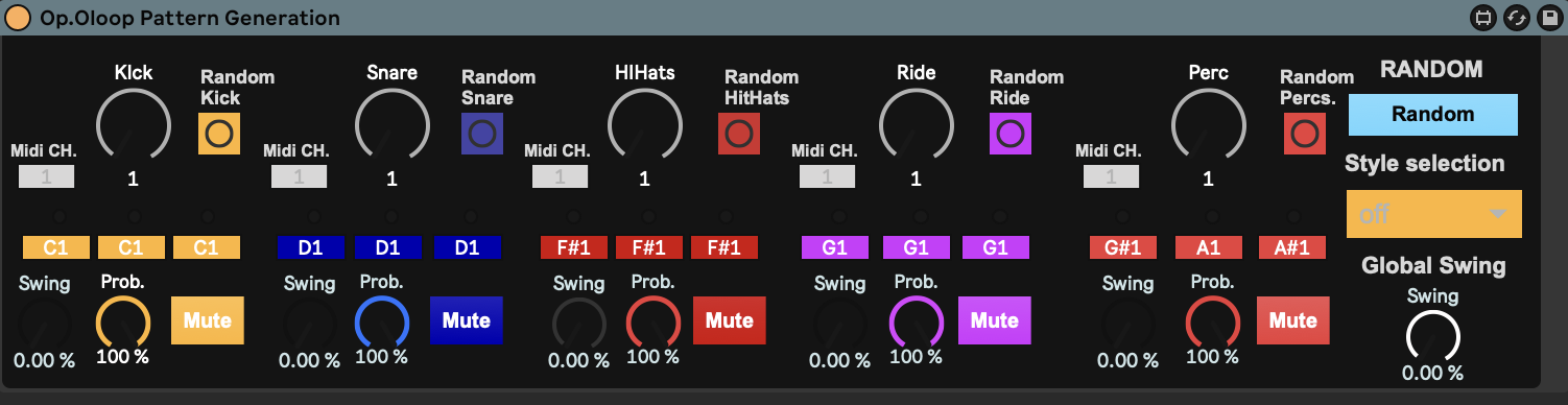 | Description: | Op.Oloop Patterns Generator is a MIDI drum patterns generator. It includes styles from trip hop, hip hop, house, techno, IDM, and Drum&Bass. The device has a random button to randomize the patterns, a MIDI router, different accents, probability, and swing per instrument and global swing. The device comes with a collection of 808 drum machine samples but treated in a glitch style, offering you a large range of palettes of sounds. It can work with every drum rack, and it is super useful to find that drum pattern that can surprise you!!! See: https://youtu.be/iRujCNxlxvs?si=tskObW4HDvjkd4QL Buy: https://ko-fi.com/s/be94ef2415 |