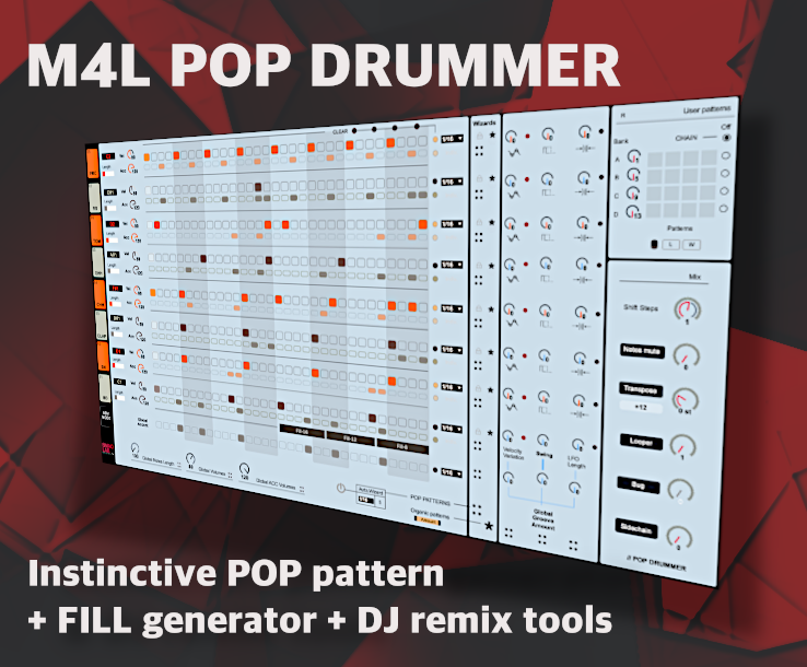 | Description: | M4L POP Drummer is an instinctive & creative Midi Step Sequencer for POP MUSIC. __Get the DEMO version straigth below __Get the PRO version on our website SMAOLAB.ORG Inspired by the famous M4L the Drummer, this new steps sequencer proposes: - 8 tracks (polyphonic) - Huge User Interface - Specific POP Pattern generator algorithm (Sequences & FILLS) - DJ effects - 8 Individual Roger Linn Swing functions - And many more features ! Better than words, we propose you to test the plug in and tell us what you think : a DEMO is available below. The DEMO version is fully functional, but the plugin pauses every 5 minutes & resumes automatically after 5 to 10 seconds. More info at : https://smaolab.org We hope you will enjoy as we did to develop and use it ! |