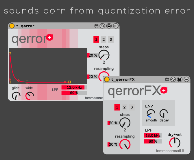 | Description: | Sounds born from quantization error Quantization error = difference between original analog signal 🎤 and digital representation 💻 after quantization. This creates noise/distortion ⚡, especially in low-bit-depth systems. 👉 qerror devices link pitch ↔ quantization error to shape timbres: 🎶 Low notes = coarse, buzzy error 🎵 High notes = finer, hiss-like error 🎹 Attacks/decays = bursts then thinning VIDEO DEMO: https://youtu.be/pHmH1e6JpL0?si=b2WQwFk6V-3INLMQ 🎹 qerror instrument Sine wave 🌊 → copy reduced in bit depth 🪓 → subtracted from original ➖ → leaves only the quantization error ⚡ = synthesis output. Parameters: 🔢 steps – number of divisions 📊 steps % – ADSR depth on steps 🔄 mode – 1 (round), 2 (round + normalize), 3 (truncate) ⏬ resampling + resampling % 🎚️ LPF frequency / % 🎧 wide 🌀 glide 🎛️ qerrorFX Same principle, but applied to input sounds 🎤. Parameters: 🔢 steps + steps % 🔄 mode (1,2,3) ⏬ resampling + % 🎚️ LPF frequency / % Onset notes 🎶 trigger steps, resampling, and filter. 🌊 smooth → softer attack 🕰️ decay → longer tail |