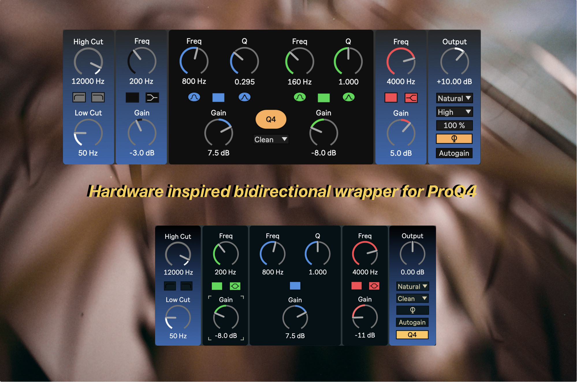 | Description: | Hardware inspired bidirectional wrapper for ProQ4. Hi, You’re about to obtain one of my fully bidirectional Max for Live wrappers for Pro-Q4. I truly believe this will have a profoundly positive impact on your workflow in Ableton Live. Available models 4000 – all the detail you’ll ever need. 73 – very broad curves, perfect with Pro-Q’s warm mode to get that “iron” sound. 550 – also broad, but finer than the 73. Flip between shelf and bell filters. Tube - famous curves. (Only available for Kirchoff-EQ at the moment.) Installation -Move the downloaded .amxd file(s) into Live’s Max for Live folder: /Users/User/Music/Ableton/User Library/Presets/Audio Effects/Max Audio Effect/ProQ4-4000-Vst3.amxd (Tip: You can also open this folder by right-clicking any Max for Live device in Ableton’s browser and selecting “Open in Finder”.) -Move the ProQ4 preset that came with your download into FabFilter’s preset folder. -Load the wrapper onto any track. -When you first open the patch, Pro-Q4 will likely open in its default state. Open Pro-Q4’s plugin window and load the corresponding preset (e.g. channel_4000.ffp). -Now save the M4L patch as a preset under your preferred name by using the disk button in the upper-right corner. This will store Pro-Q’s state, so the next time you load your preset it will open with those settings by default. Note: You can also create your own Pro-Q presets. The EQ bands controlled by the patcher are mapped in chronological order (e.g. Band 1 = Low Cut, Band 2 = Low Shelf, etc.). However, I recommend not using stepped mode when you do so, as there is a lot happening under the hood and it may lead to funky behavior. Operation -Even though the wrapper is built to recreate the creative focus born of analog hardware limitations, you can still take full advantage of Pro-Q4’s more advanced functions—and faster than ever before. Simply click the yellow button to open the plugin window, a far more convenient solution than Live’s tiny wrench icon. The first 4–6 bands (depending on the model) are fully bidirectional, so any changes you make in the plugin are instantly mirrored in the wrapper. -Stepped Frequency enabled (model 550 and 73): wrapper mirrors the hardware exactly. -Stepped Frequency disabled: frequency control spans Pro-Q’s full spectrum, with frequencies displayed as in Pro-Q4. (Example: a 10 kHz shelf in the 550 translates to 2.4 kHz in Pro-Q4.) -Unsure about a knob? Hover to read the Live info text. -Pro-Q quality modes are fully supported; any latency changes are automatically reported to the wrapper. Note: In stepped mode, the frequency dial itself is not yet fully bidirectional—but the correct value will always display beneath it. Important Notes -You must own Pro-Q4 to use these wrappers. (This is not a standalone EQ.) -Currently, most wrappers support only the VST3 version of Pro-Q4. -I have only tested this with Ableton 12 on Mac. -The Tube-style version could not be built for Pro-Q4 due to missing correct shelf filters, so I build one for Kirchoff-EQ. Make sure to check it out! Patch Notes v1.0 – initial release v1.1 – GUI update. Wrapper now adapts better to different Live versions. v1.1 – Now includes model "4000S", a smaller version of the wrapper. Happy mixing! |