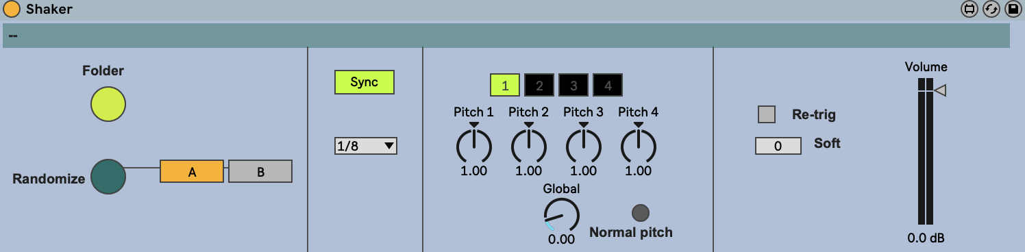 | Description: | THE SHAKER The idea behind is to use a sections of music files in a folder, and the shaker will create loops from random selections of those tracks. Like throwing a bunch of different materials into a shaker and geting a chaotit but musical rsult. I've used it in many compositions and situations, both live and in the studio. 1. Press "Folder" button and select a folder containing sound files (Shaker will search also in subfolders). A random selection of 8 loops will be made out of all the files. ATTENTION: if you select a folder containing a lot of subfolders (like the iTunes library) it will take a while to scan. 2. Press PLAY in live to start. 3. Select one of two banks A or B. When pressing "Randomize" button, a new random selection will be made in the bank that is actually NOT playing. 4. Swap between "Sync" or "Manual" to manually select loop 1, 2, 3 or 4. 5. Choose a different rate in the little menu. 6. Play around with the pitchs of each loop and the global pitch. 7. "Re-trig" mode will start the loops everytime from the begining. 8. "Soft" will soften the begining and end of each loop. ENJOY and credit if used please! fedepablo.com |