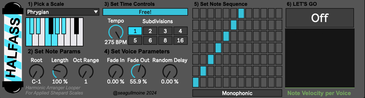 | Description: | HALFASS: Harmonic Arranger Looper For Applied Shephard Scales! A midi note generator that helps create endless rising custom sequences from the 12-tone scales of your choosing. Make those tones rise endlessly, but also melodically. Shepard tones are a well known audio illusion! Read more here: https://en.wikipedia.org/wiki/Shepard_tone Note: Your MIDI instrument must have velocity to make use of volume "fade ins" and "fade outs" to assist in the illusion. Not all settings will achieve the desired illusion, but it is still a fun tool to play with. |