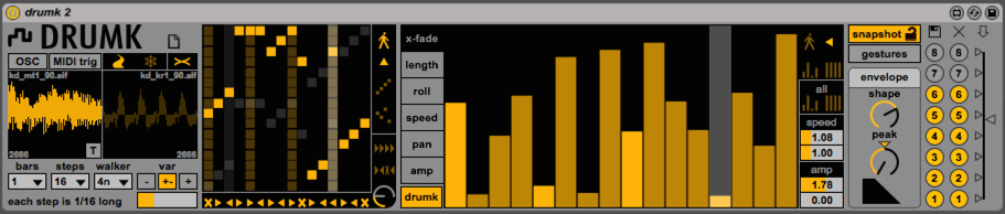 | Description: | Drumk 2 is a Max For Live instrument device for beat-oriented sample manipulation. Based on a grid and multisliders, drumk 2 is a really powerful and versatile tool: you can use drumk 2 to process drums samples, voices, strings or any kind of source you can imagine. In drumk 2 you can choose to design sound with your hands, meticulously editing each step parameters and playback modes, but you can also using aleatory functions as random buttons, drunkwalk, walker mode, and time variation probabilities. Drumk 2 stores up to 8 snapshots per preset. This makes drumk 2 an useful instrument in studio as well as during live performance. Recall snapshots on the fly, trigger random functions from your controller, play steps with your MIDI keyboard: you can create and perform your song with tons of variations using a couple of loops and following your inspiration. Slices are triggered in sync with Ableton Live transport or via MIDI note messages. No external objects are used in drumk 2. More infos : http://k-devices.com/drumk/ Take a look to the teaser : http://www.youtube.com/watch?v=cT4CpHOuZkI RELEASE NOTES: http://k-devices.com/releases/ |