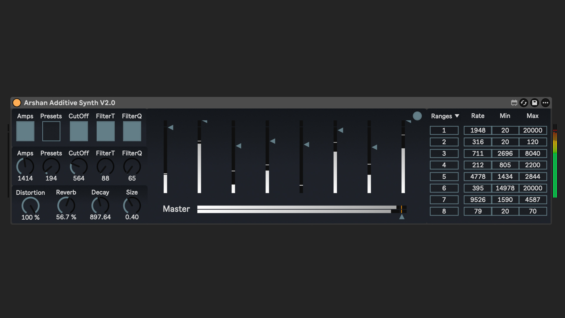 | Description: | updates include a built-in distortion combining clip distortion, od, waveshaping and ableton live's fuzz distortion + a charming reverb w/ prism algorithm. also there's a new option to use customizable random/generative frequencies w/ selective range for each one of the eight lines w/ independent rates besides the integrated presets. i did also add some more eq controlling features as well. watch the full tutorial here: https://youtu.be/_SBU7EBwHf4 |