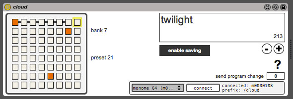 | Description: | cloud is a preset manager (like Kapture or other devices), and a monome device manager. Non-monome users should try my other device called Brain. It saves and recalls pretty everything in your live set, and also interacts with up to 6 monome devices in your live set. Basically, the first row is a page selector (there are 7 pages), and a tap tempo on the eighth button. _ first page : cloud, the presets manager. You can access 32 presets in 24 banks, so 768 presets are available ; the second, third and fourth rows are for the banks and the fifth, sixth, seventh and eighth are for the presets. It acts as follow : To save a preset; - click on the "enable saving" button, store and insert buttons appears to show that cloud is ready to store. - choose the bank and preset index on which you want the preset to be stored by clicking on corresponding buttons on the grid, if the preset slot is already in use, its name will be displayed. - type the name of your preset in the text box (it is important to name the preset, it will prevent you from overwriting presets later). To store the preset, you have to choose between "store" and "insert". "store" will overwrite any pr-existent preset on the index number chosen, if you choose a slot already in use, all its parameters will be lost. "insert" will automatically increment any preset at the specified index or higher to make room for the new one. cloud has some limitations (that could be expanded if I get time) : - 45 parameters on the two first devices on 24 tracks (if you want to use more than two devices and save their parameters, you must put it in effect racks, the height macros on the two first racks will be saved). - 8 parameters on the 2 first devices on 12 return tracks (you must rack your effects if they have more than 8 parameters) - volume, sends, mute, solo, panning on 24 tracks and 12 return tracks - record arm on 24 tracks - transport : tempo, time signature, clip trigger quantization, groove amount, and midi recording quantization - input and output routings on 32 tracks and 12 return tracks (version 3.5) All the values are stored with the device when you save your live set. You can also save a Live device preset as usual with Live devices. A cloud preset represents more than 2500 parameters values, it can hold 1024 presets, so it is more than 2.560.000 values that may come with the device when it is loaded, so please be patient. However everything seems to be ok, the device may need a few more seconds to acts as expected. But when loaded it should be fast and reliable. The parameters are saved from their object id, so you might be able to move things without loosing anything. However, for the same reason, any track or device added after brain is loaded won't have its parameters saved. _ The program change can help you to control additional hardware, synth, controller, or anything that receive program change messages. You can choose a program number or disable this function for each preset, if you don't want to send program change, set it to 0. Choose the midi canal output in your track output parameter in live. _ To link another device, you don't have to modify cloud, you can use the example in the patcher, or copy and paste it in the device you want to link, a bit tricky but it works. Save your soul. |