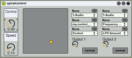 | Description: | This small utility can help you to control 2 parameters with one controller. The "Control" knob moves the orange dot in 2d space on a spiral trajectory. The resulting control values are the dot's coordinates. The movement on the 2d spiral can be slowed down with "Speed" control. |