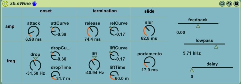 This is a sinewave synth with a feedback mechanism that allows gradual introduction of harmonics. It has extended control over amplitude and pitch trajectories when starting, ending and overlapping notes. |