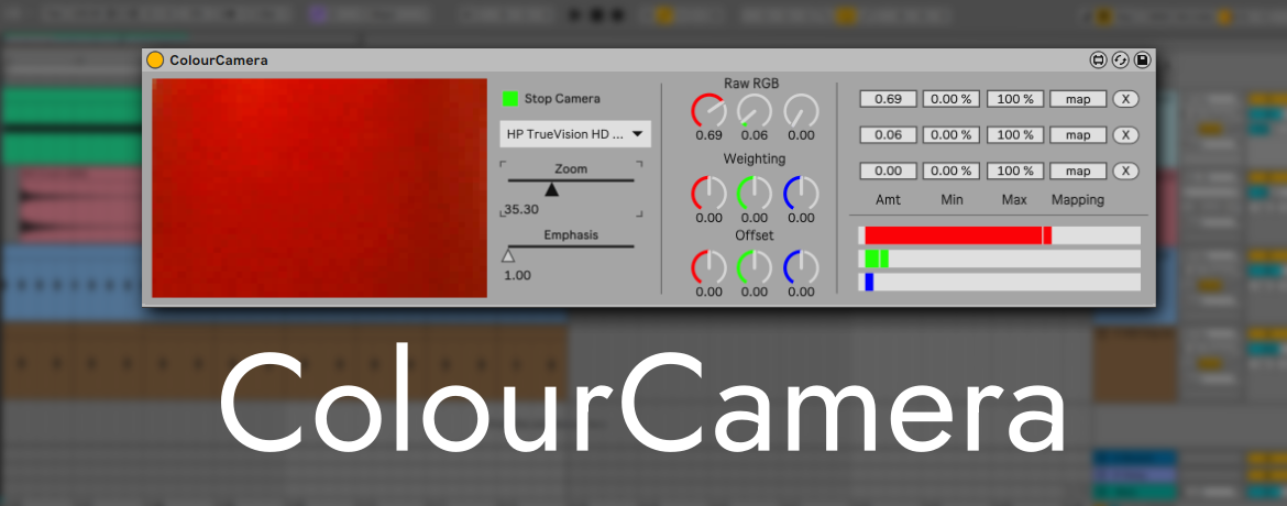 | Description: | ColourCamera is a device which creates mappable values based on the RGB values of a video feed. It was inspired by and designed based on zumisio's RGB Camera 1.1 device (https://maxforlive.com/library/device/9806/rgb-camera) but features expanded functionality (e.g. zoom, colour weighting and colour offset controls). It is unlikely I will continue development on this device further as I developed it for a portion of a university project, but feel free to share any bugs if they're an easy fix! You're also welcome to modify and share the device as long as attribution is included (CC-BY-SA 4.0). User manual: https://avoset.neocities.org/ColourCamera%20Manual.pdf |