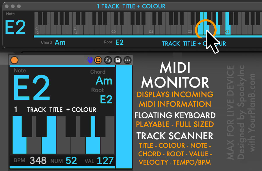 | Description: | Now it's easy to see exactly what you're playing (and what midi track you're on) Combining our popular floating keyboard and our new Scanner device, this device displays note, chord, root key, CC# and values being played, as well as the placement on a keyboard all in large, easy to read sizes. The difference with this advanced SCANNER version are the Device blocks and floating keyboard notes match the Track colour, as well as the Track Title. You can also adjust the Tempo directly from the device. Click the top right to see the full title name, useful for tracks with super long titles! Just like our free original version, the floating keyboard is perfect for your second monitor. And in this new version, you can also click the floating keyboard to play notes! |