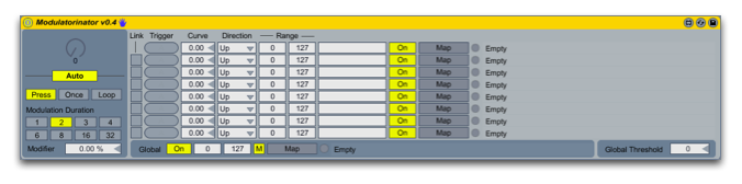 | Description: | This Maxinator Device gives you the ability to easily modulate controls and effects with a press of a button. Modulatorinator is great for creating filter sweeps, dynamic delays, volume swells and fades, and distortion crescendos that activate at the touch of a button. Up to Eight parameters can be mapped to Modulatorinator along with a Global parameter that kicks on whenenver any of the other parameters activate (perfect for turning a device on and off as you modulate it). If eight parameters isn't enough, you can chain Modulatorinators to your heart's content (or you run out of CPU cycles). Each mapped parameter is individually configured for direction (the modulation can sweep up, down, or up and down), range, and curve. More info on my website. |