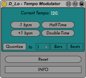 With this device, you can now nudge (+1 / -1 bpm), halve, or double your tempo with the press of a button. These operations can be quantized to a user-determined tempo-relative period of time. |