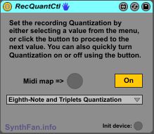 | Description: | A rather simple tool which I made for someone on the Ableton forum; it allows you to control or automate the recording quantization. You can select an option from the menu, you can click the round button to change the setting to the next value or you can use the On / Off switch to toggle between no recording quantization or the setting as you defined it. The init knob at the bottom can be used if you somehow changed the quantization value using Live's Edit menu. |